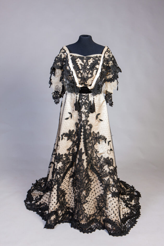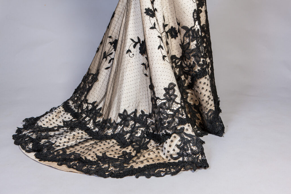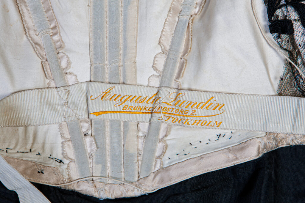 Det är då som Augusta Lundins ateljé skapar Margareta Kennedys klänning, i två delar beige siden, svart broderad brysseltyll och band av svart sammet. I livets foder sitter det åtråvärda ”varumärket”.